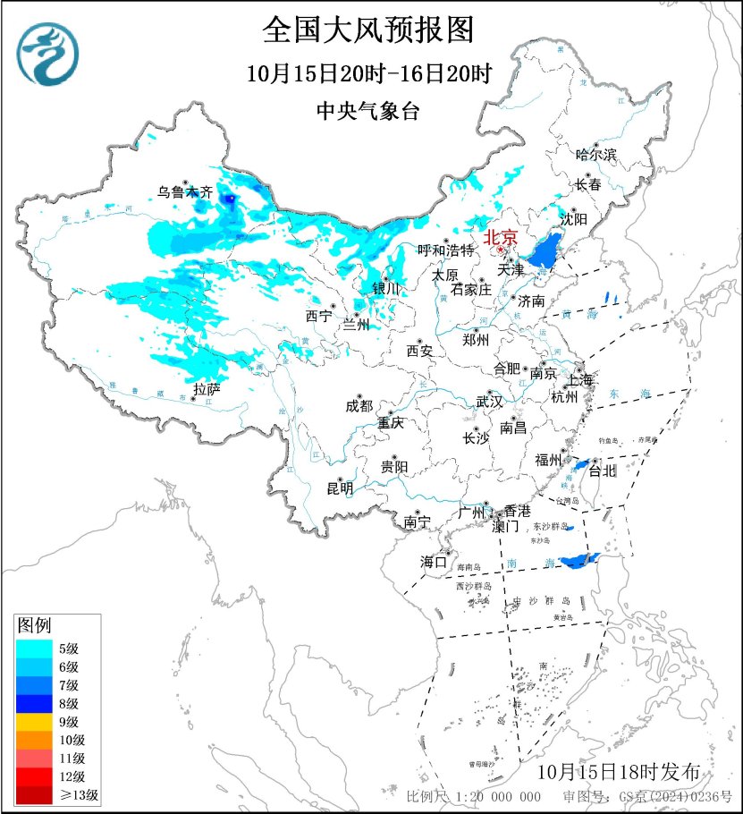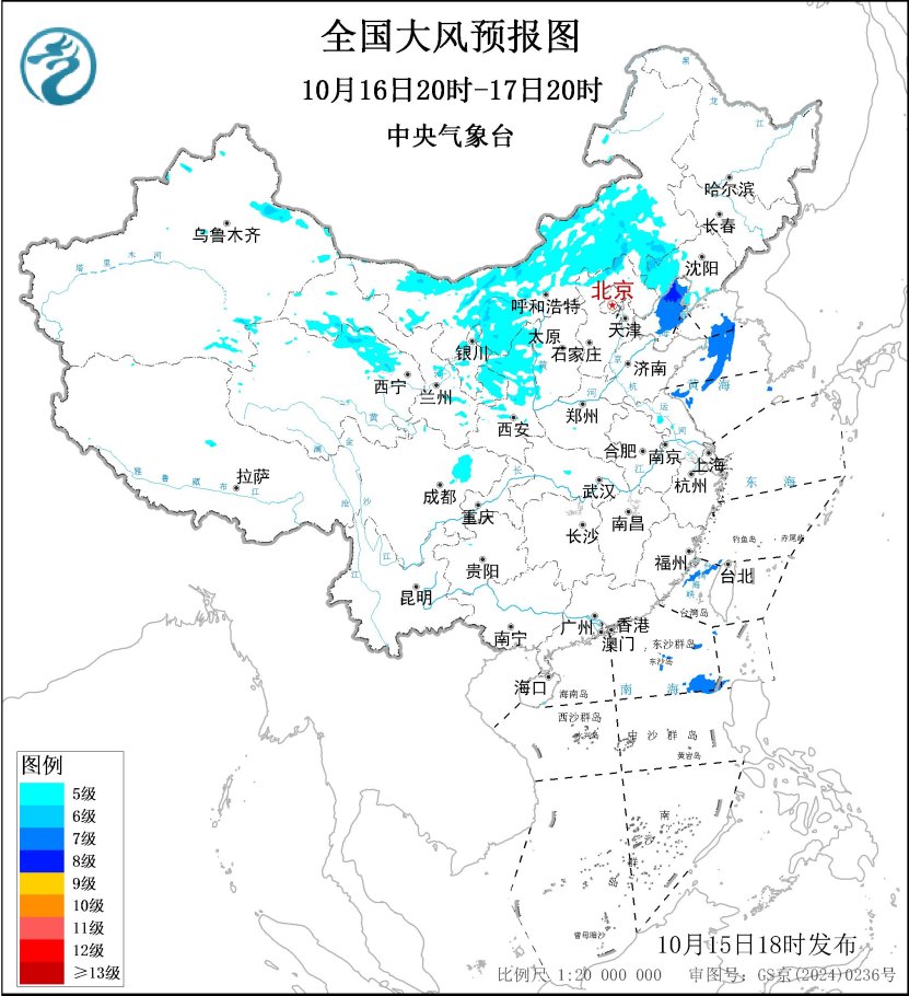 10月16日20时至17日20时,内蒙古中西部和东南部、青海北部、陕西中北部、河北北部、辽宁西部和南部等地的部分地区有5~6级、阵风7~9级的大风;渤海、黄海中部部分海域将有7~8级、阵风9级的大风。