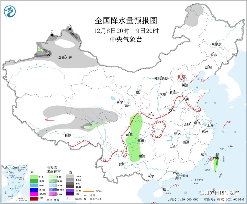 12月8日20时至9日20时,内蒙古东北部、黑龙江西北部、新疆北部、西藏东北部、青海南部、四川西北部等地部分地区有小雪或雨夹雪,其中,新疆北疆和伊犁河谷、西藏东北部等地部分地区有中到大雪(5~9毫米)。西北地区东南部、西南地区东部、台湾岛大部等地部分地区有小到中雨,其中,台湾岛东北部等地部分地区有大雨(25~45毫米)。辽东半岛、西藏等地部分地区有5~6级风;台湾海峡、巴士海峡将有7~8级大风、阵风9级;东海南部海域、台湾以东洋面、南海大部海域将有6~7级大风、阵风8级(见图3)。