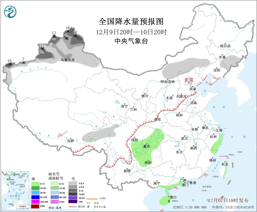 12月9日20时至10日20时,内蒙古东南部、河北北部、吉林东南部、辽宁东部、新疆北部、西藏东部、川西高原等地部分地区有小到中雪,其中,新疆北疆和伊犁河谷等地部分地区有大到暴雪(10~18毫米),阿勒泰、塔城北部部分地区24小时新增积雪深度超过10厘米,局地15~20厘米。浙江东部、福建东北部、湖北西南部、西南地区东部、广西东南部沿海、广东西南部沿海、台湾岛东部、海南岛等地部分地区有小雨,其中,海南岛东部等地部分地区有中雨。辽东半岛、西藏等地部分地区有5~6级风;南海大部海域、台湾海峡、巴士海峡将有5~7级大风、阵风8级(见图4)。