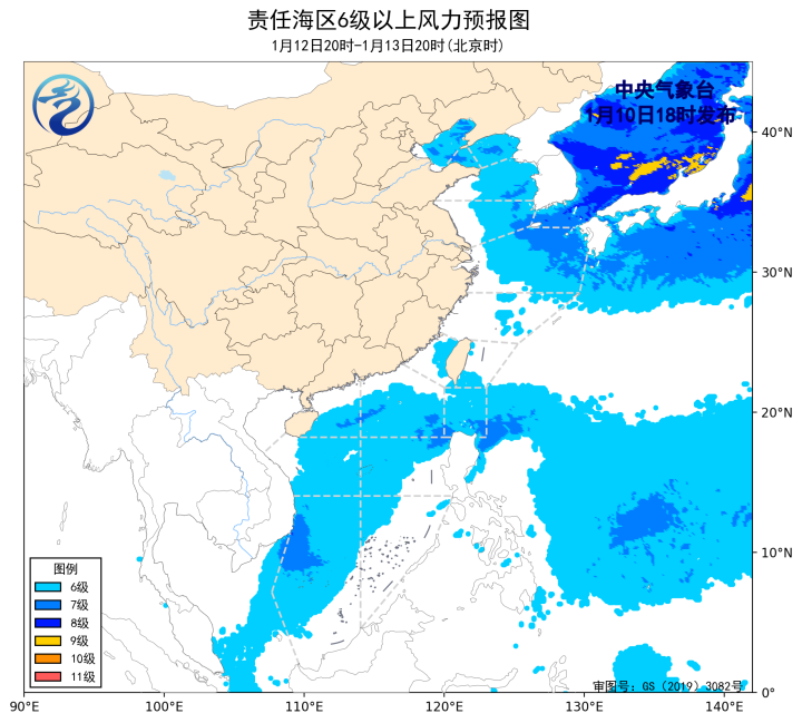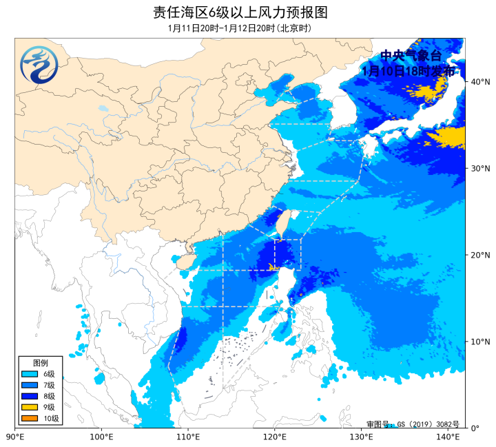 1月10日02时至14时,渤海、巴士海峡、南海东北部海域出现了6~8级、阵风9级的偏北风或东北风,渤海海峡、黄海大部海域、东海北部海域出现了6~7级、阵风8级的偏西风或西北风,南海中西部和南部海域出现了5~6级、阵风7级的东北风或偏北风。