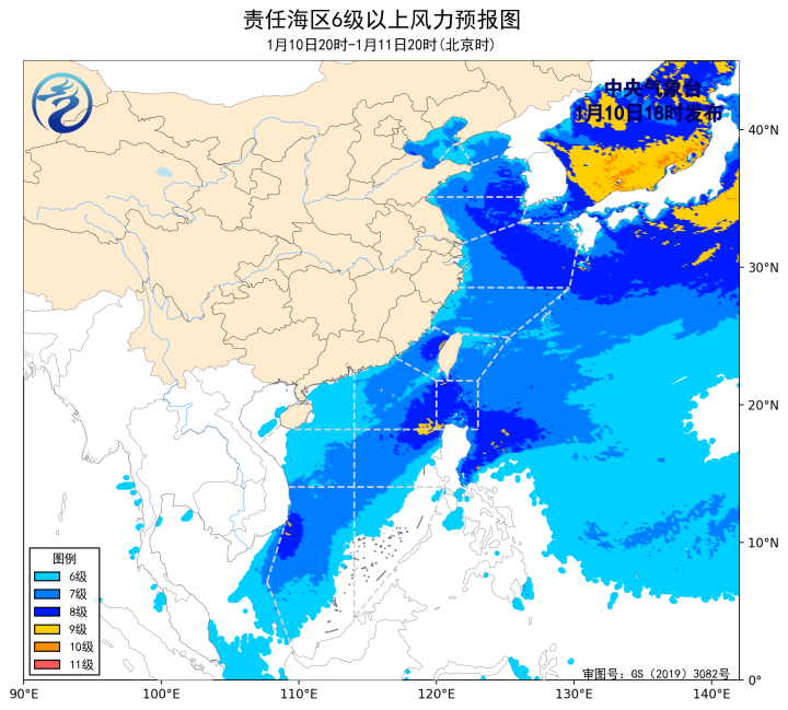10日20时至11日20时,黄海南部海域、东海北部海域将有6~8级、阵风9级的西北风,台湾海峡、巴士海峡、南海东北部海域将有6~8级、阵风9级的东北风,渤海将有5~7级、阵风8级的西北风转西南风,黄海北部和中部海域、东海南部海域将有6~7级、阵风8级的偏北到西北风,台湾以东洋面、南海中部和西南部海域将有6~7级、阵风8级的偏北到东北风,渤海海峡将有5~6级、阵风7级的偏北到西北风,南海西北部海域将有5~6级、阵风7级的东北风。