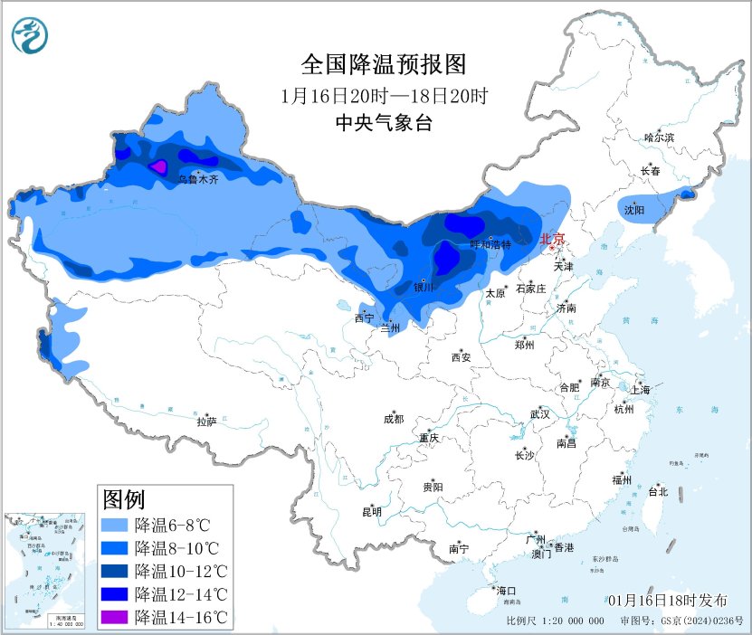 中央气象台1月16日18时发布寒潮蓝色预警:
