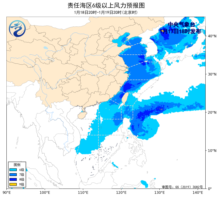 18日20时至19日20时,东海南部海域将有5~6级、阵风7级的偏北风增大到7~8级、阵风9级的东北风,渤海海峡、黄海大部海域、东海北部海域、台湾海峡、巴士海峡、南海东北部和中东部海域将有5~7级、阵风8级的偏北到东北风,渤海、台湾以东洋面、南海西南部海域将有4~6级、阵风7级的偏北到东北风。