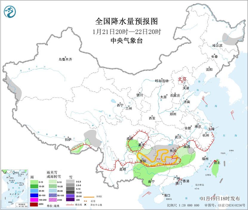 图6 全国降水量预报图(1月20日20时-21日20时)