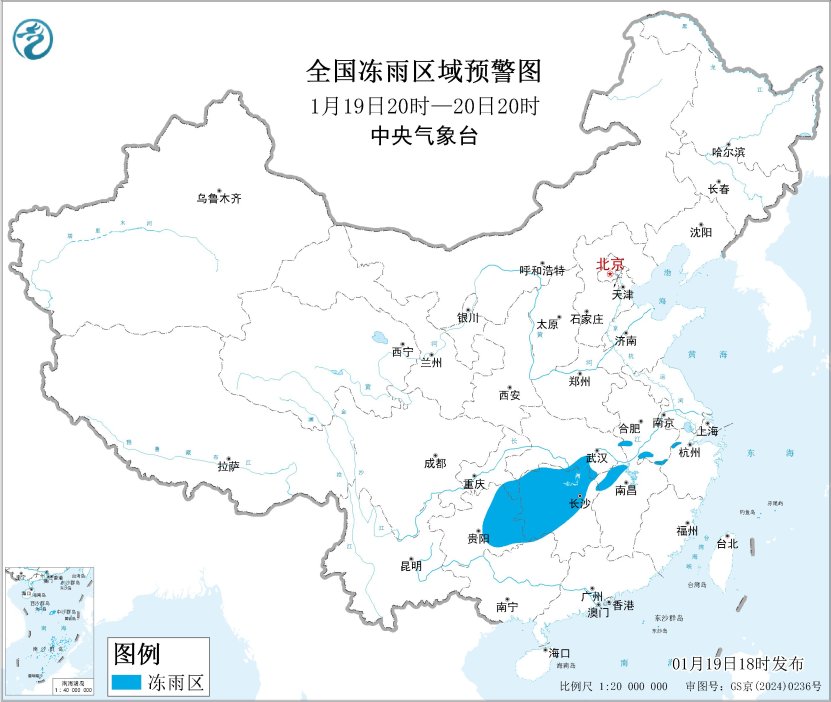 预计,1月19日20时至20日20时,贵州东部、湖南西部和中北部、重庆东南部、湖北南部、安徽南部、江西北部等地的部分地区有冻雨或冰粒,上述大部地区冻雨量1~3毫米,湖南西部、贵州东部部分地区4~6毫米、局地可达8毫米以上(见图4)。中央气象台1月19日18时继续发布冰冻黄色预警。