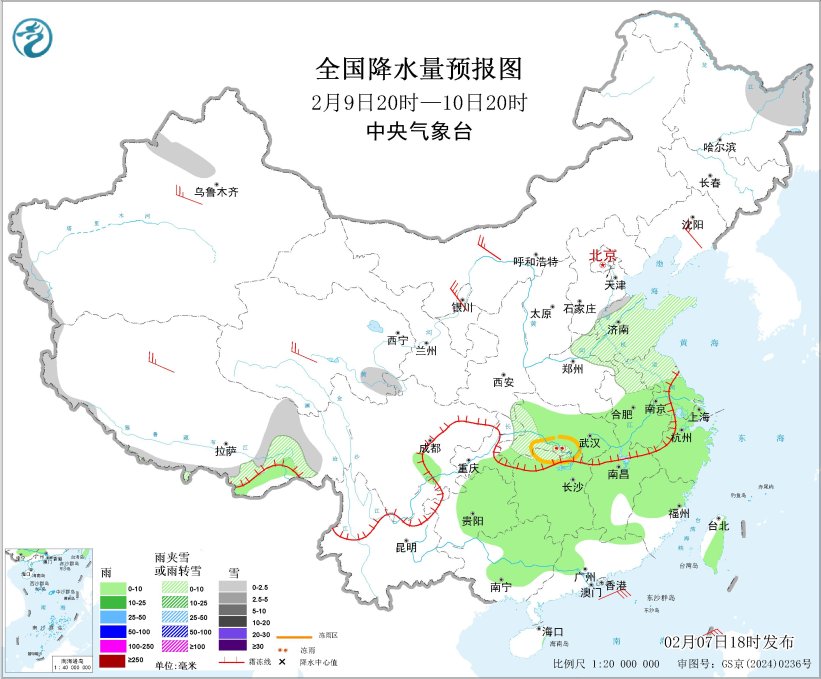 图4 全国降水量预报图(2月9日20时-10日20时)