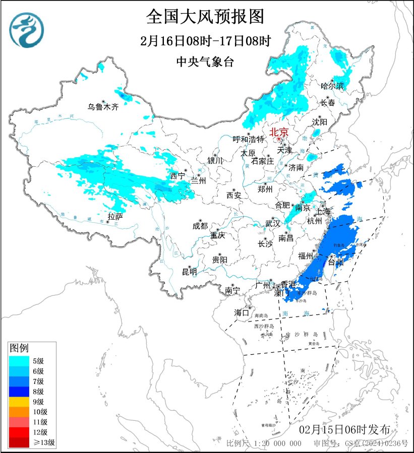 2月16日08时至17日08时,内蒙古东部、黑龙江中部、江南东北部、青藏高原北部等地有5级左右平均风、阵风6~8级;黄海南部海域、东海南部海域、台湾海峡、南海东北部海域将有5~7级、阵风8级的东北风。