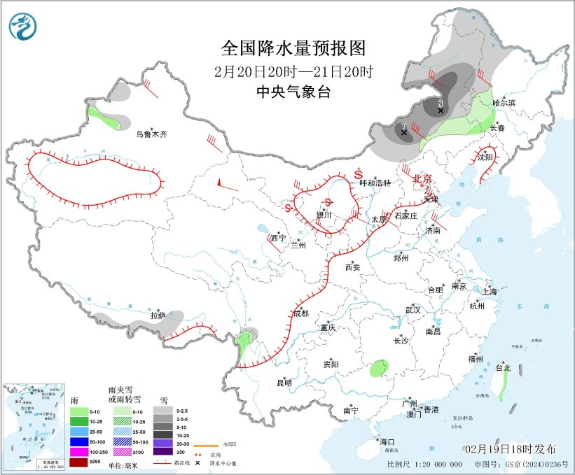 图3 全国降水量预报图(2月19日20时-20日20时)