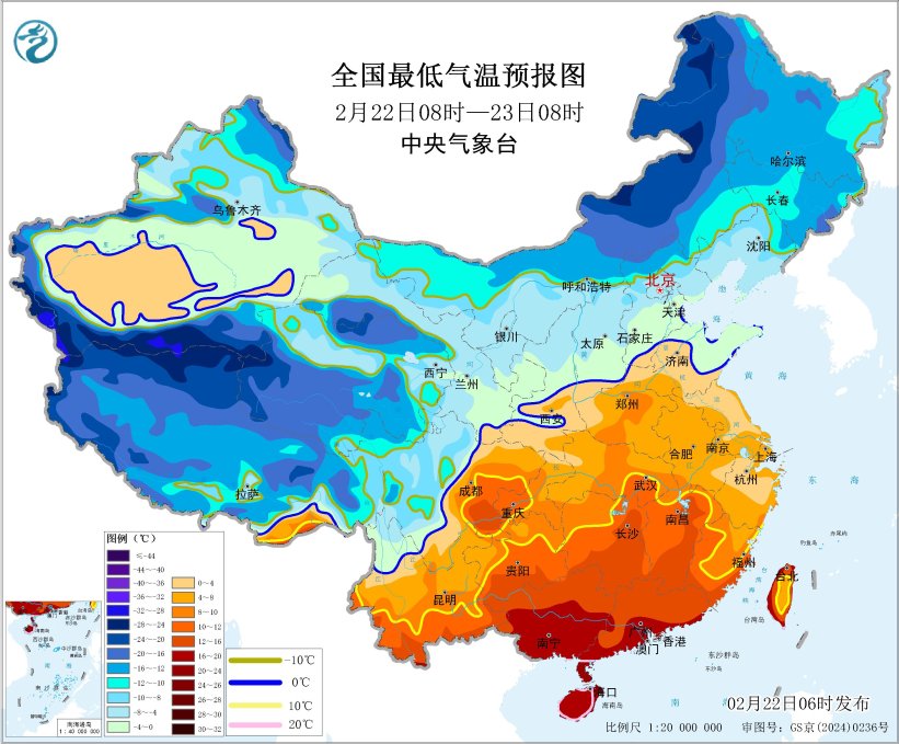 中央气象台2月22日06时继续发布寒潮蓝色预警