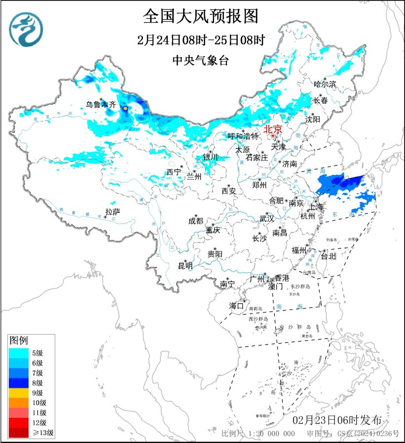2月24日08时至25日08时,新疆北部和东部、青海北部、甘肃北部、宁夏、内蒙古、河北北部、黑龙江中北部等地部分地区有4~6级风,阵风7~9级,其中,新疆东部局地阵风风力可达10级以上;黄海南部海域、东海北部的部分海域将有7~8级、阵风9级的风。
