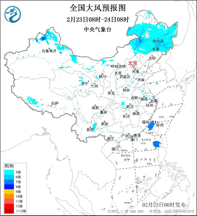 中央气象台2月23日06时继续发布大风蓝色预警: