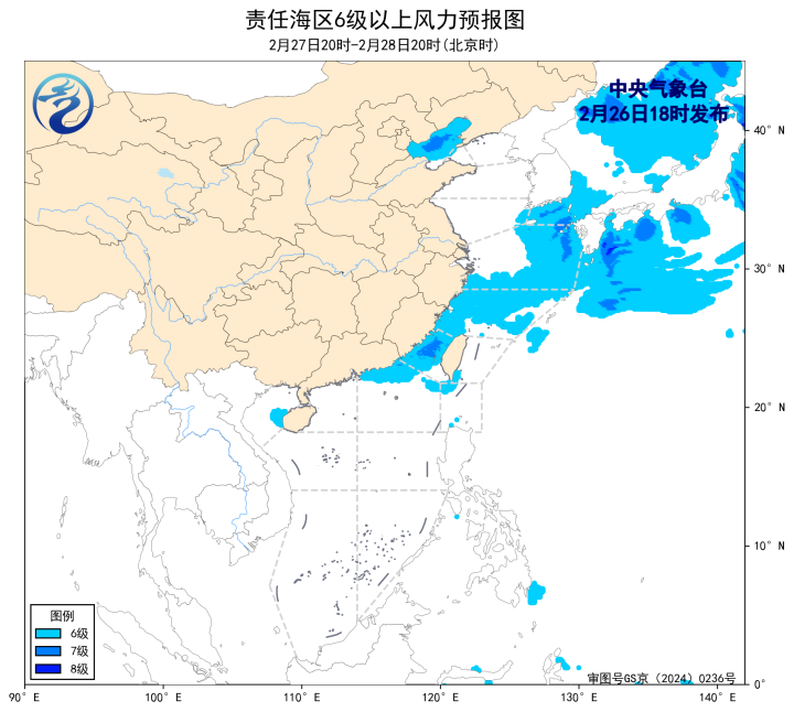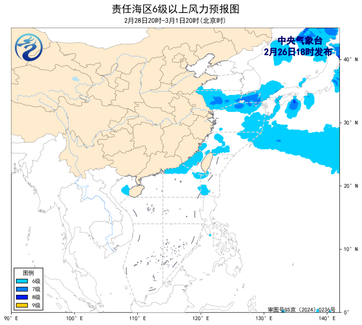 2月28日20时至3月1日20时,黄海南部海域将有4~5级增大到6~7级、阵风8级的偏东风,台湾海峡将有4~6级、阵风7级的东北风转东南风,东海大部海域将有4~6级、阵风7级的偏东到东南风。