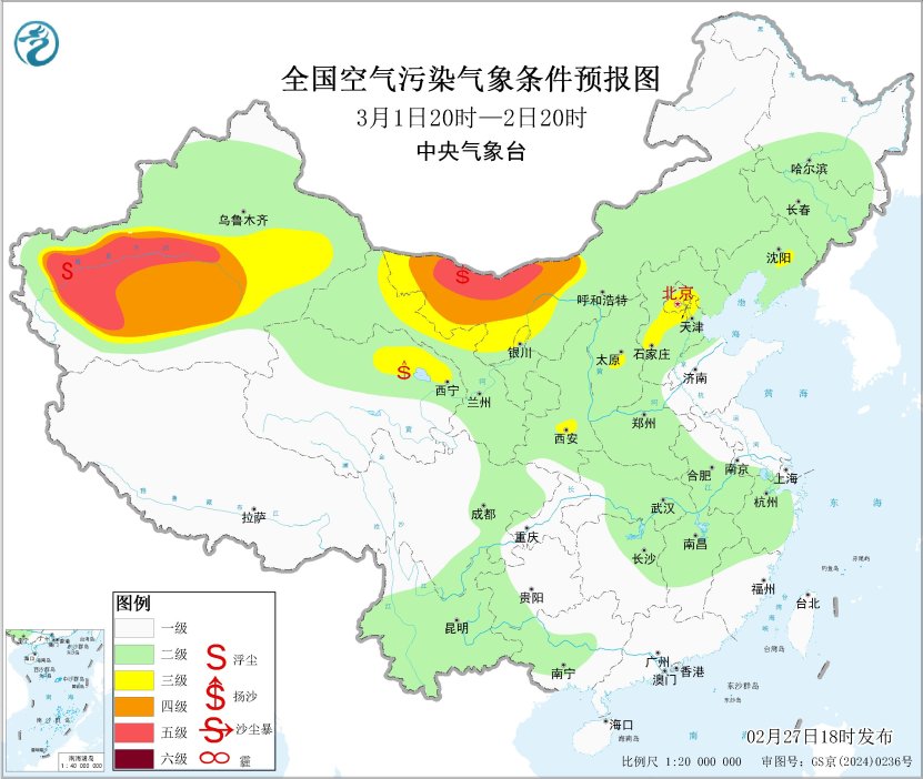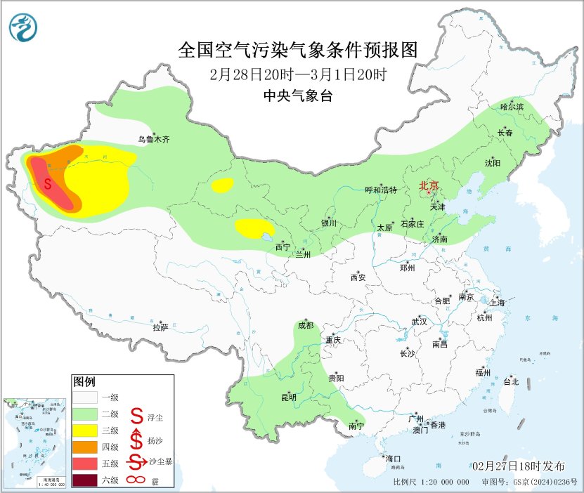 未来一周,受冷空气和降水影响,全国大部地区大气扩散条件较好,无大范围雾霾天气。3月2日至3日,新疆东部和南部、内蒙古中西部、青海北部、甘肃西部、宁夏、河北北部等地的部分地区将有扬沙或浮尘天气。