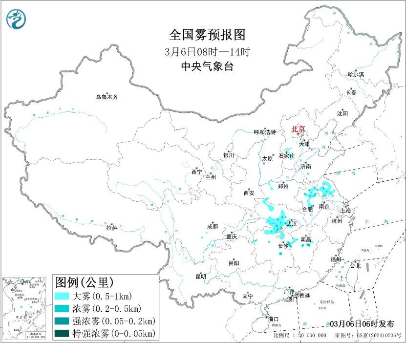 预计,6日早晨至上午,河北中部、江苏中部、安徽北部、湖北中部、湖南北部、江西中部等地的部分地区有大雾天气,其中,安徽北部、湖北中部、湖南北部、江西中部等地的部分地区有能见度不足500米的浓雾,局地有能见度不足200米的强浓雾。