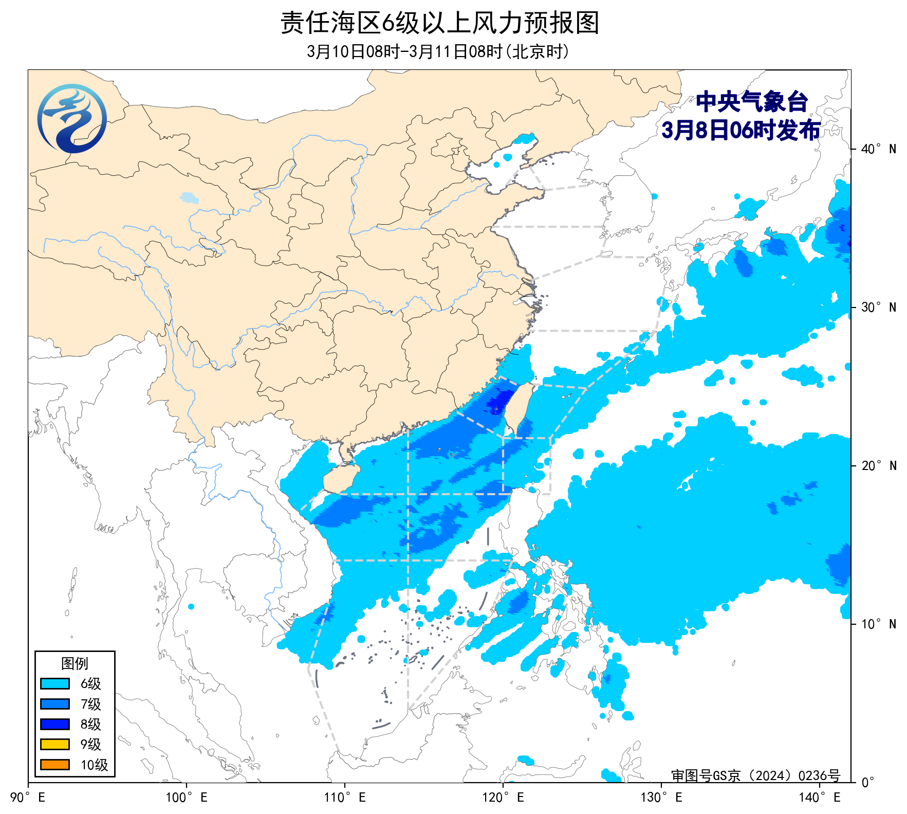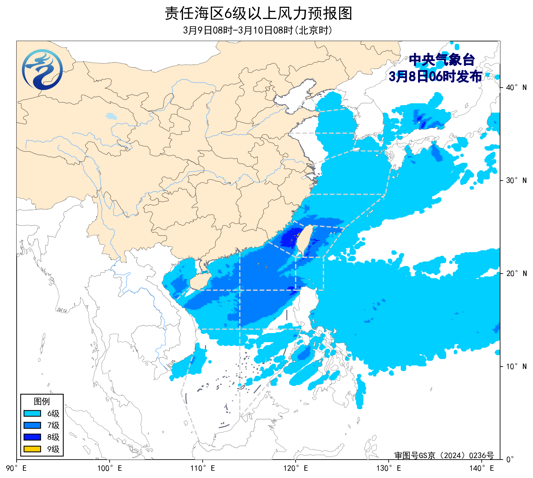 9日08时至10日08时,台湾海峡将有7~8级、阵风9级的东北风,东海南部海域、台湾以东洋面、北部湾、南海东北部和中东部海域将有6~7级、阵风8级的东北风,黄海大部海域、东海北部海域、南海西北部、中西部和南海东南部海域将有5~6级、阵风7级的偏北到东北风,巴士海峡将有5~6级、阵风7级的偏东到东北风。