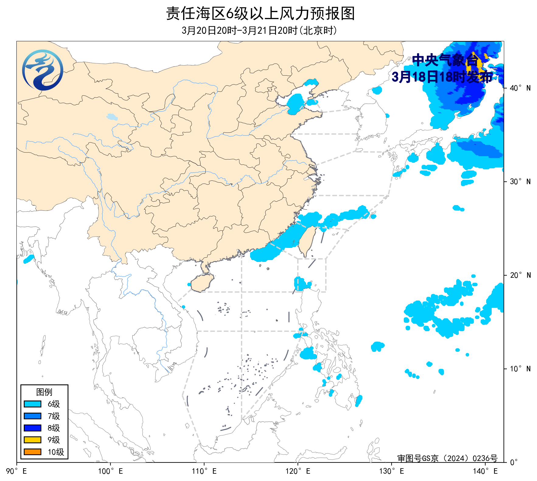 预计,3月21日夜间至25日白天,渤海、渤海海峡、东海大部海域、台湾海峡、巴士海峡、北部湾、南海东北部海域、南海中西部海域、南海中东部海域、南海东南部海域将有5~6级、阵风7级的风。