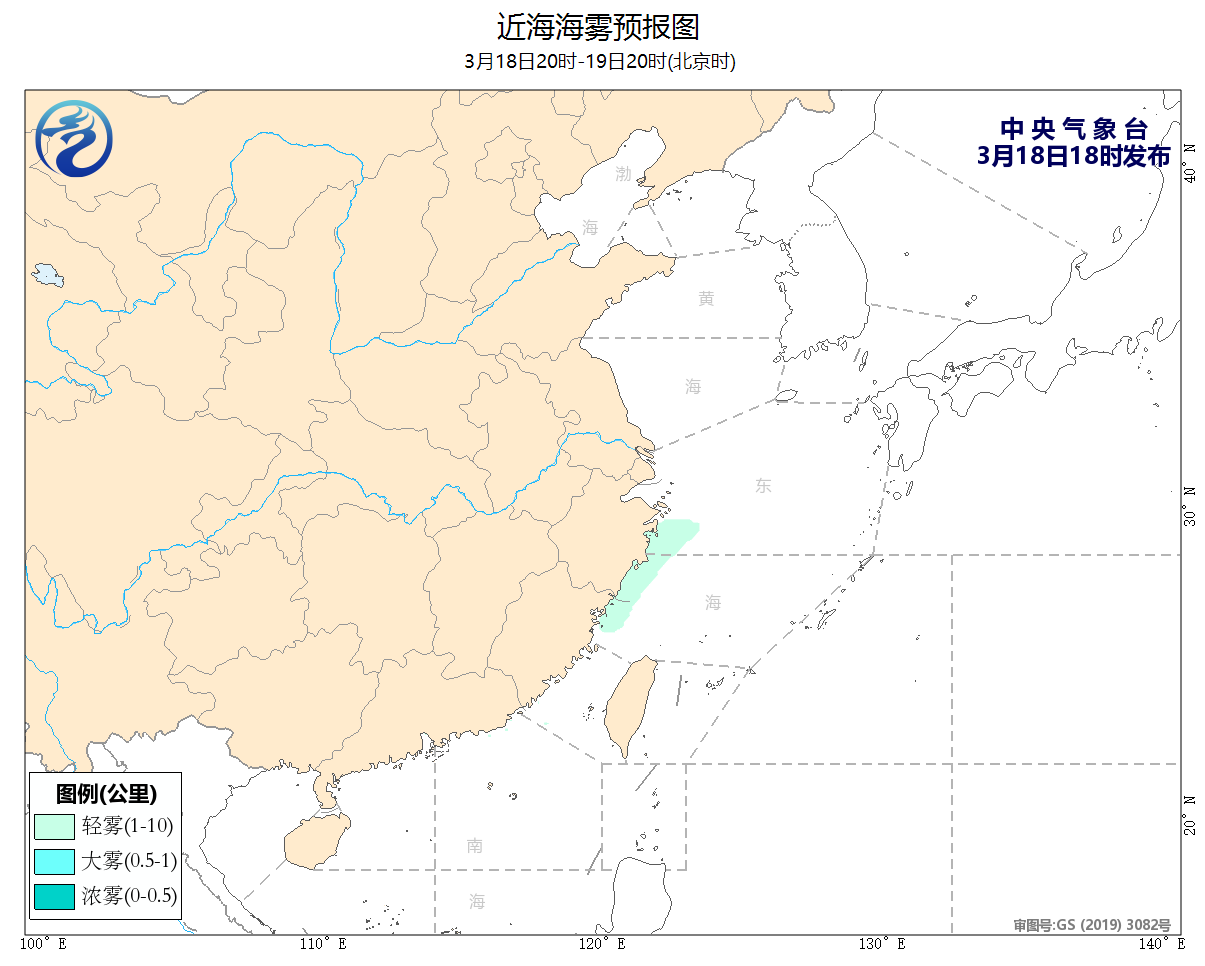 18日20时至19日20时,黄海中部海域、东海大部海域、台湾海峡将有5~6级、阵风7级的偏北到东北风, 东海西部海域、浙江东部沿岸海域、福建北部沿岸海域将有轻雾。