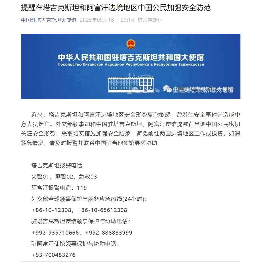近来,塔吉克斯坦和阿富汗边境地区安全形势复杂敏感,曾发生安全事件并造成中方人员伤亡。外交部领事司和中国驻塔吉克斯坦、阿富汗使馆提醒在当地中国公民密切关注安全形势,采取切实措施加强安全防范,避免前往两国边境地区工作或投资。如遇紧急情况,请及时报警并联系中国驻当地使馆寻求协助。