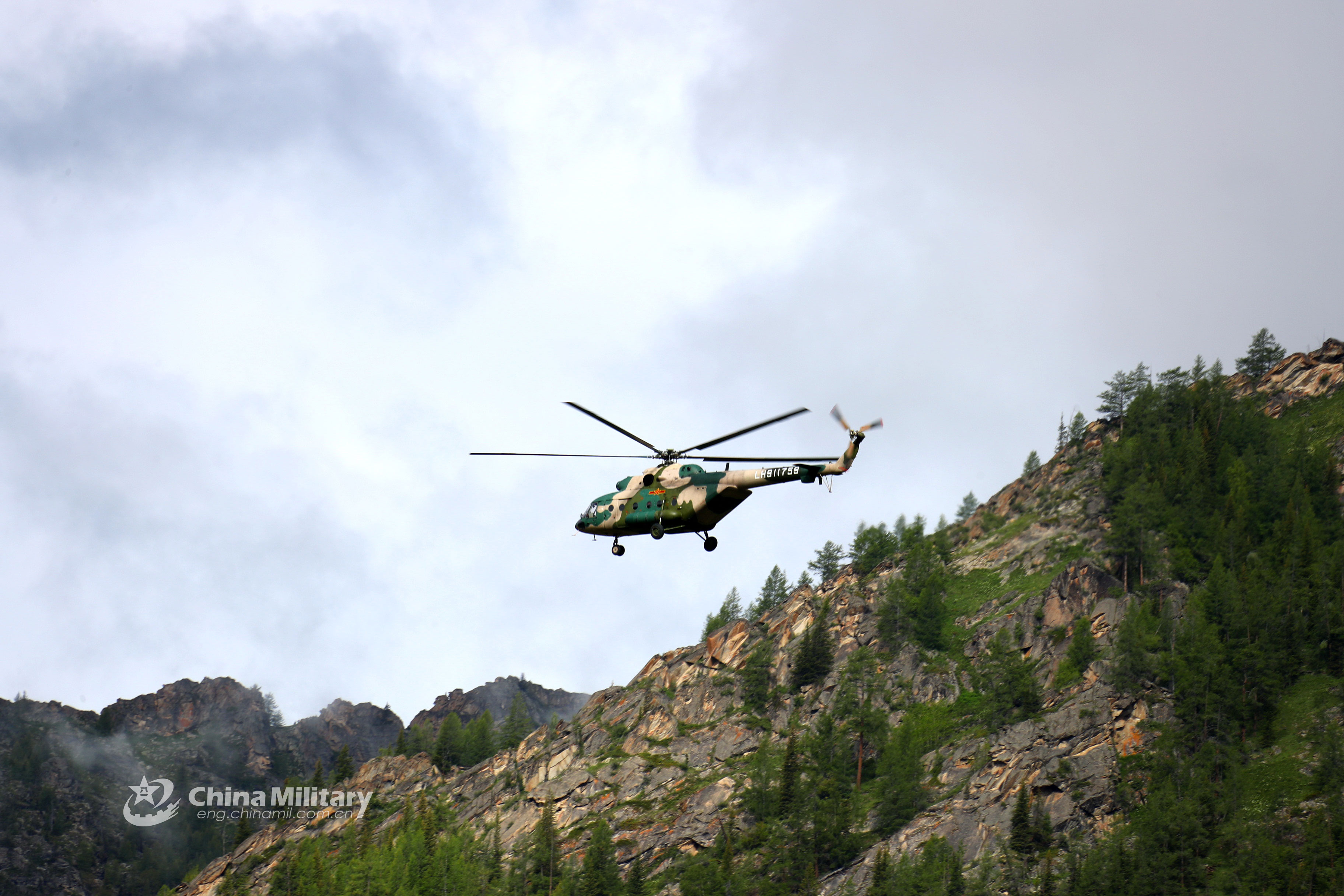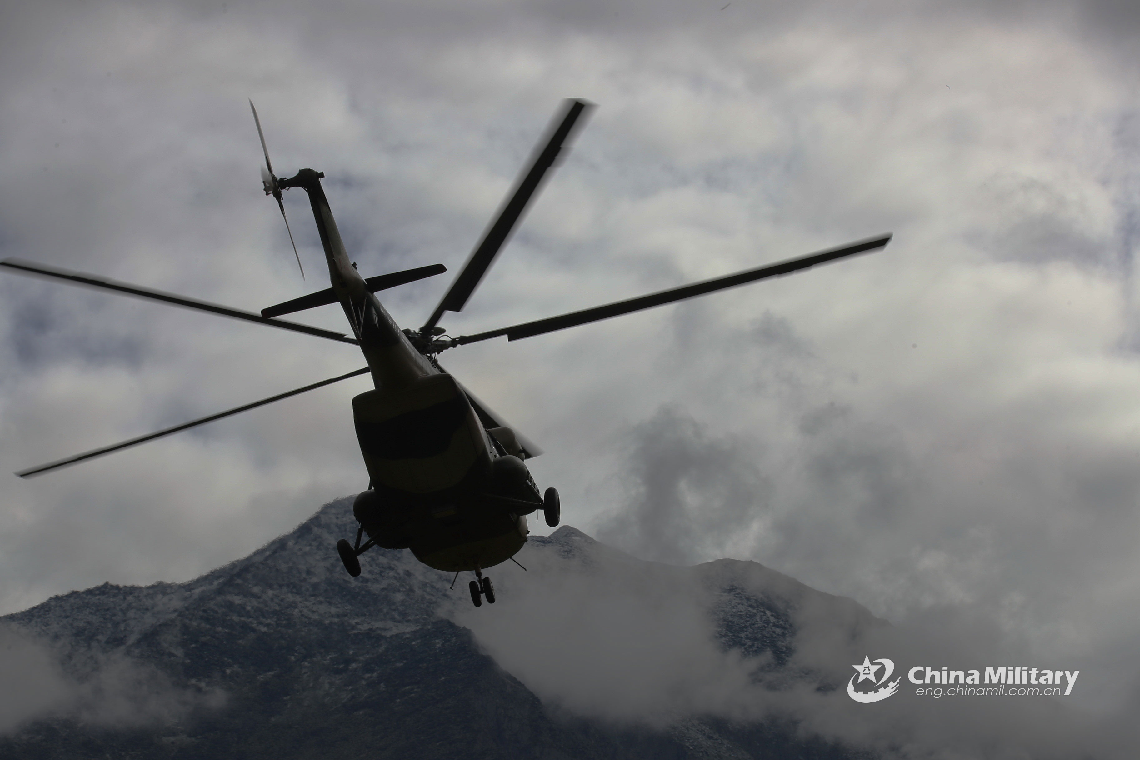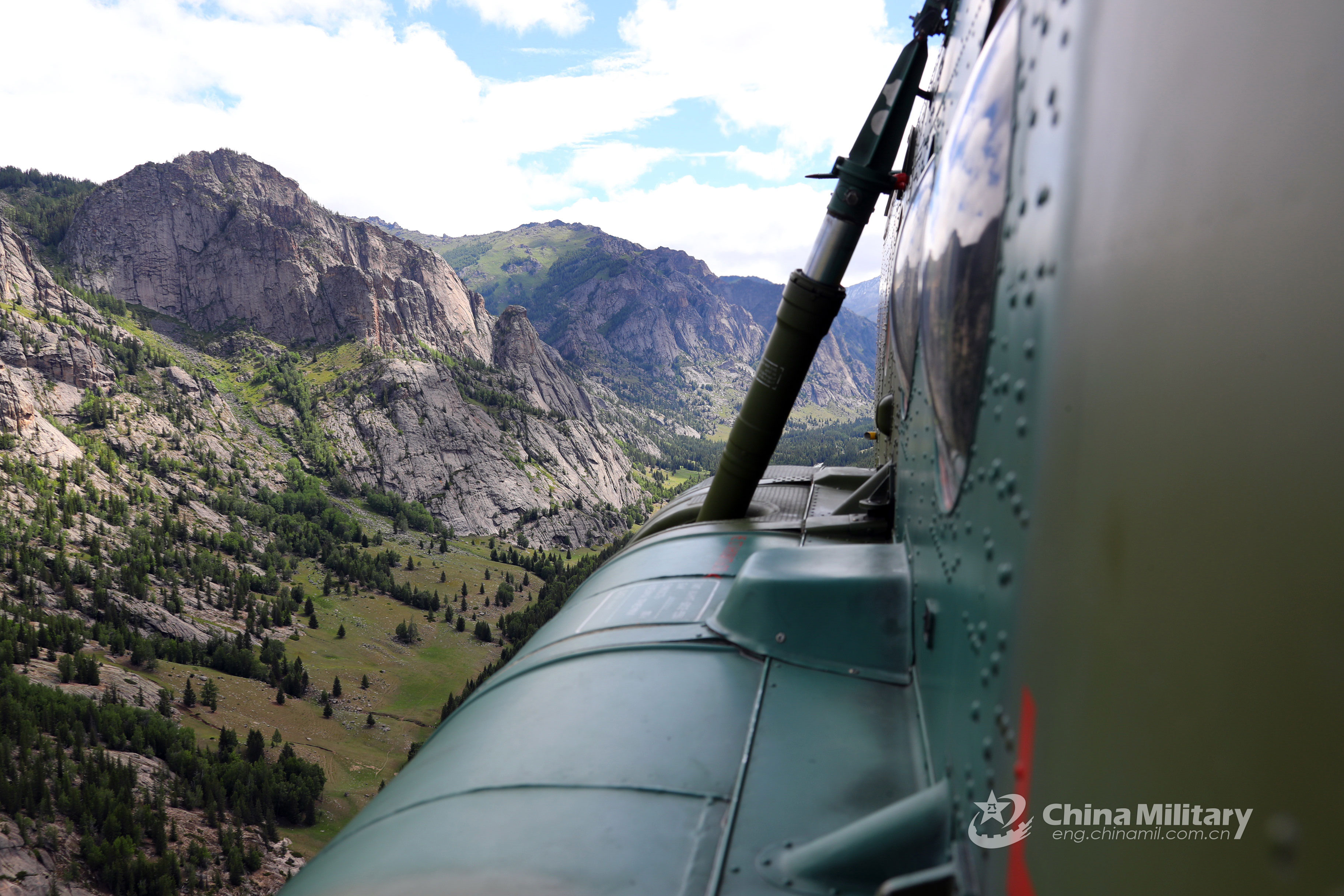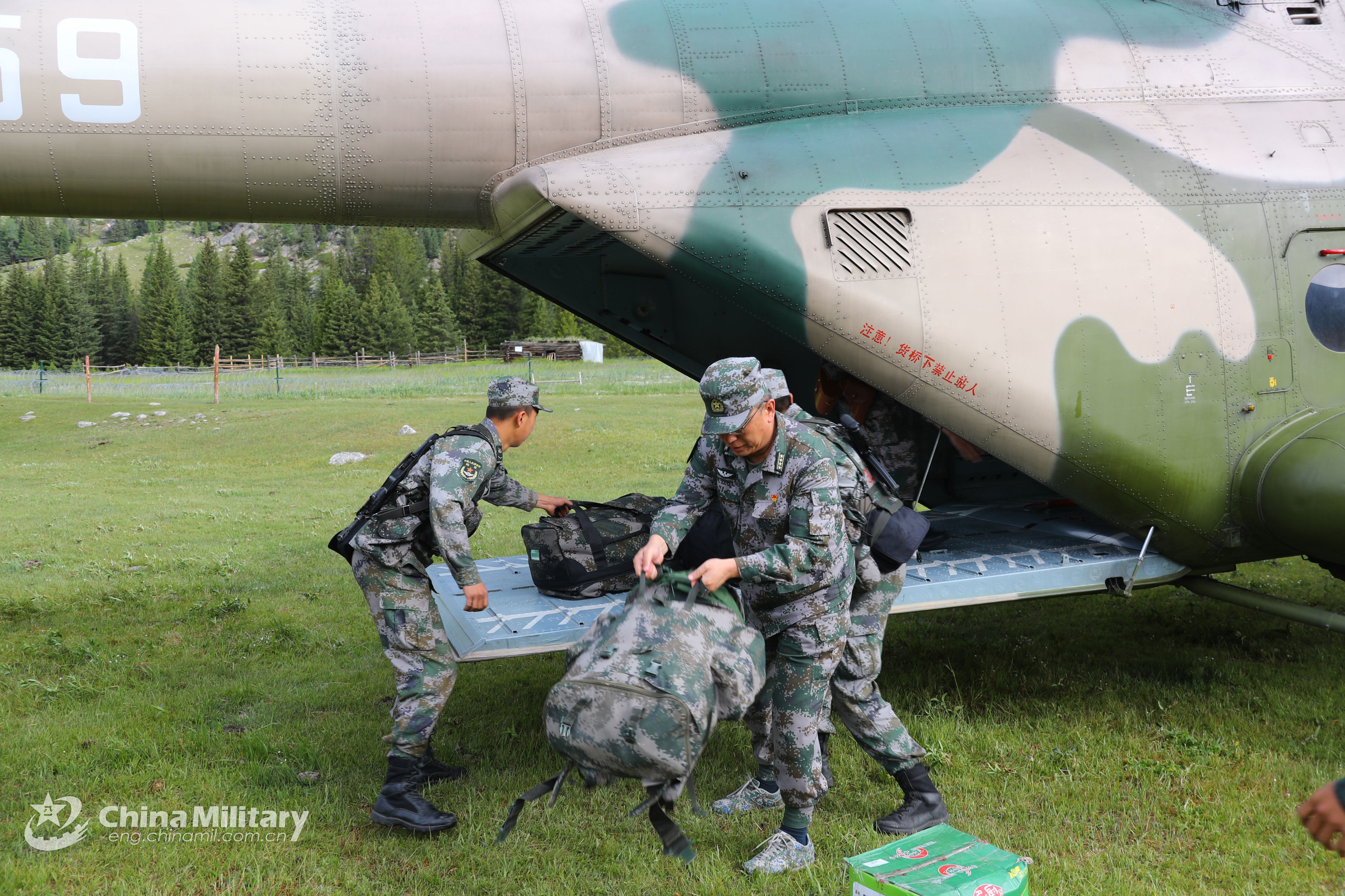 6月末,陆军航空兵一架米-171直升机在位于新疆的中蒙边境地区阿尔泰山脉深处的一个军事哨所附近降落后,士兵从机舱内卸下了物资。(中国军网英文版)