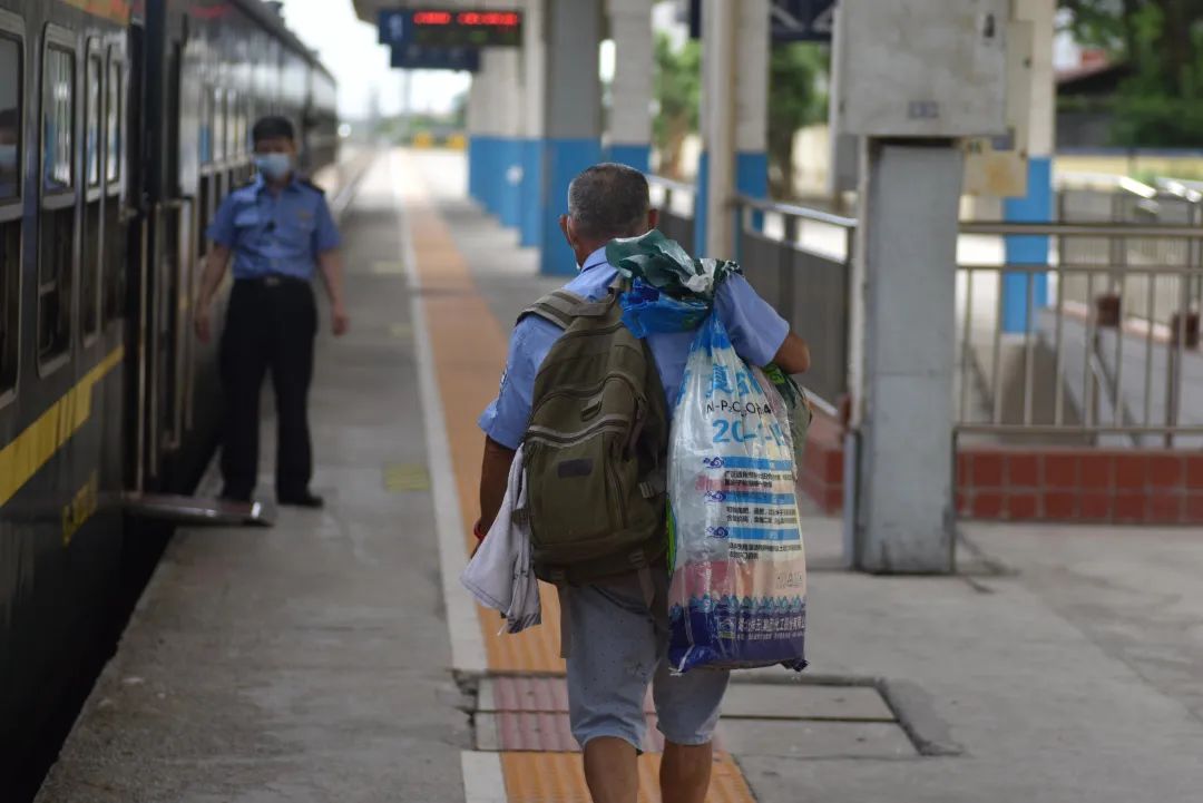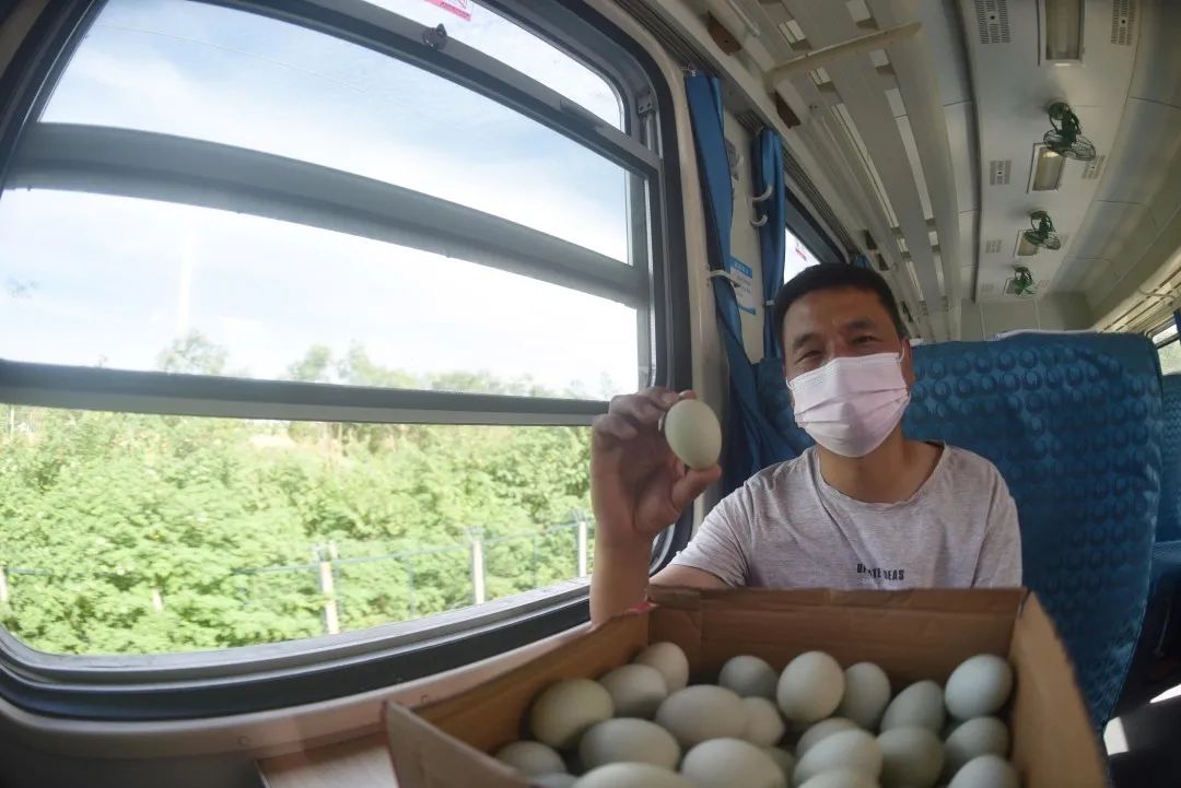 踏着早上的阳光,在麻城工作的张先生提着一箱绿壳鸡蛋,踏上回家的6025次列车。“这些绿壳鸡蛋是麻城的土特产,经济实惠,口感也好。我每次都会带一些回家。”张先生介绍。