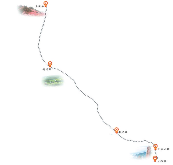 列车运行线路:麻城站、周铁岗乘降所、新洲乘降所、团风乘降所、黄州站、浠水站、横车乘降所、蕲春站、栗木乘降所、武穴站、蔡山乘降所、孔垄站、小池口站、九江站。