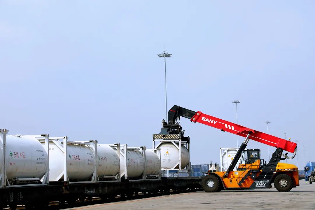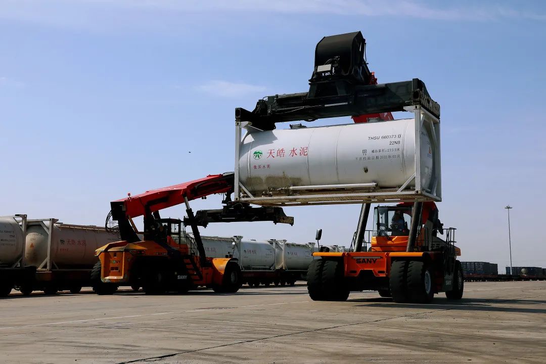 9月23日,在呼和浩特货运中心沙良物流园内,两台正面吊正往来穿梭,吊起白色的罐式集装箱装上专用平车。4小时后,满载着散装水泥的集装箱列车将沿唐包铁路奔向京津冀地区,助力当地建设。