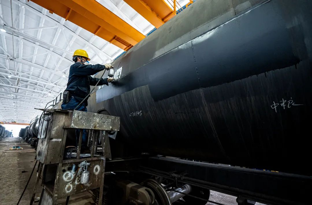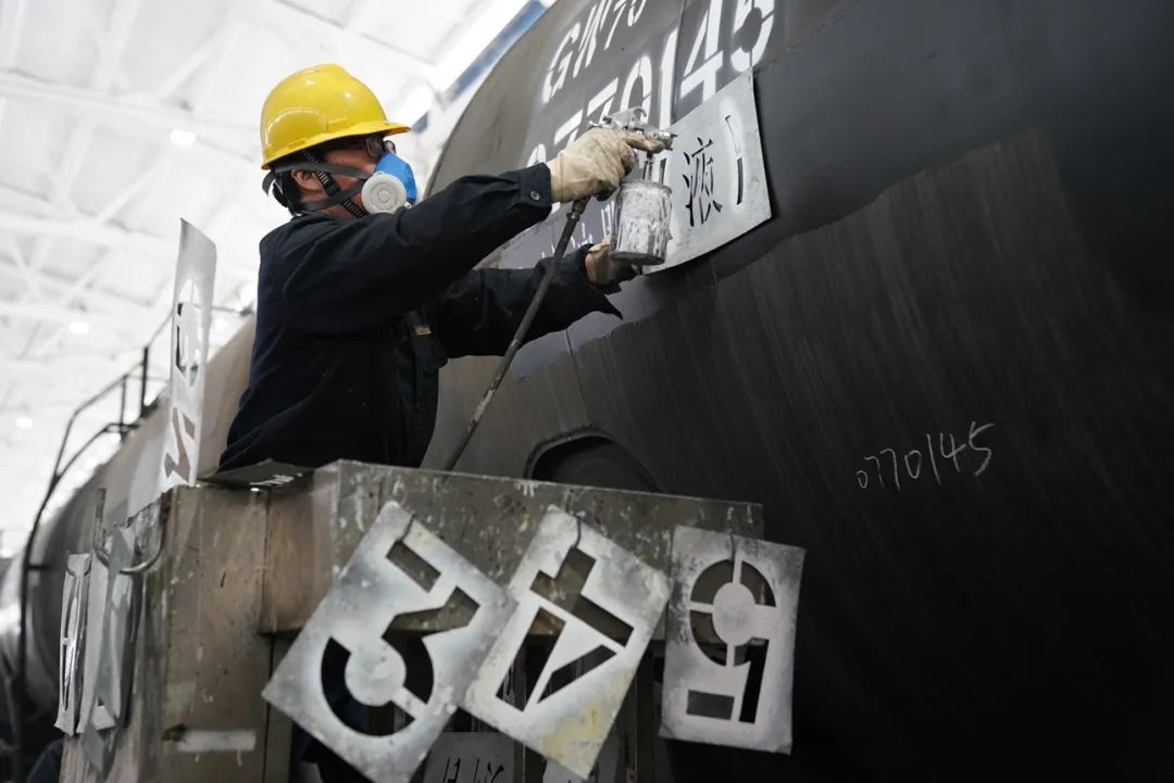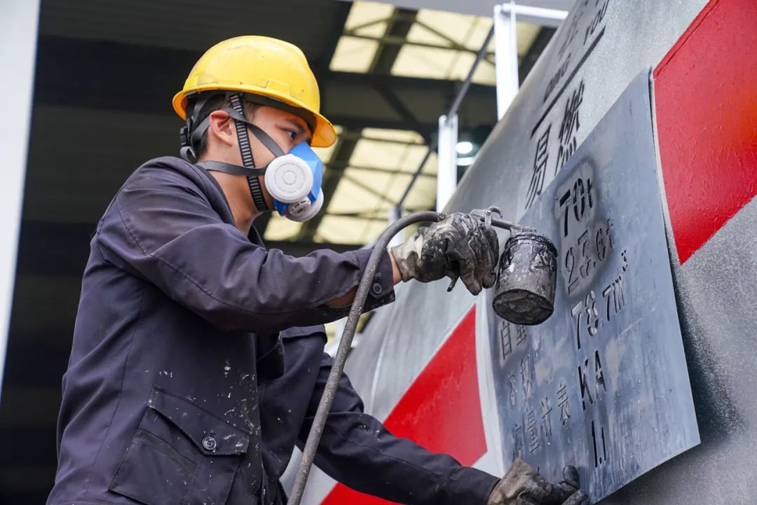 今天,油漆组的重头戏是涂打十辆罐车的色带。“这些罐车的色带呈红色,主要是起到警示的作用 ,表示装载的是危险品。”黄桦军说。