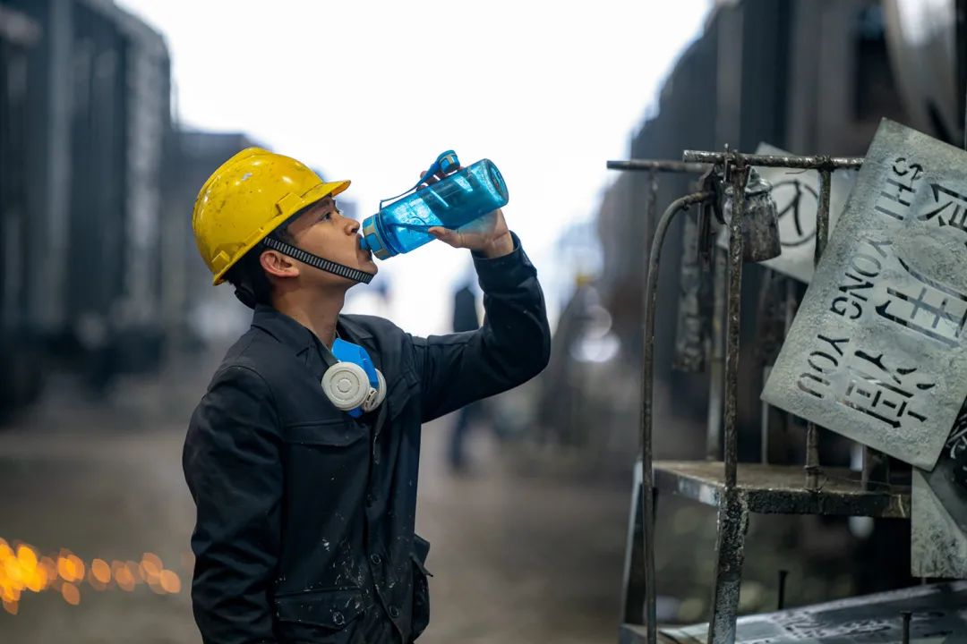 历经两个小时的奋战,黄桦军和组员终于完成了最后一条色带的涂刷。他脱下防毒面具,捧起水壶就是一顿痛饮。此时他的黑色工作服也显得格外“出彩”:白色、红色、黄色、银色……俨然一套亮丽的“迷彩服”。