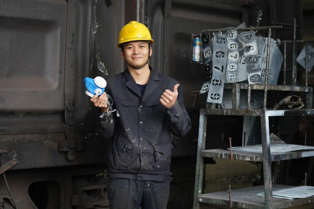 “叮当叮当……”标签牌相互碰撞,发出清脆的声音,像是在吹响“战斗”冲锋号。“滋滋滋……”黄桦军的左手在车体上固定住标签板,右手按下喷枪,白色的油漆呈伞状喷出,瞬间一股油漆味向周围发散,白油漆也星星似地点缀在他的衣服上。