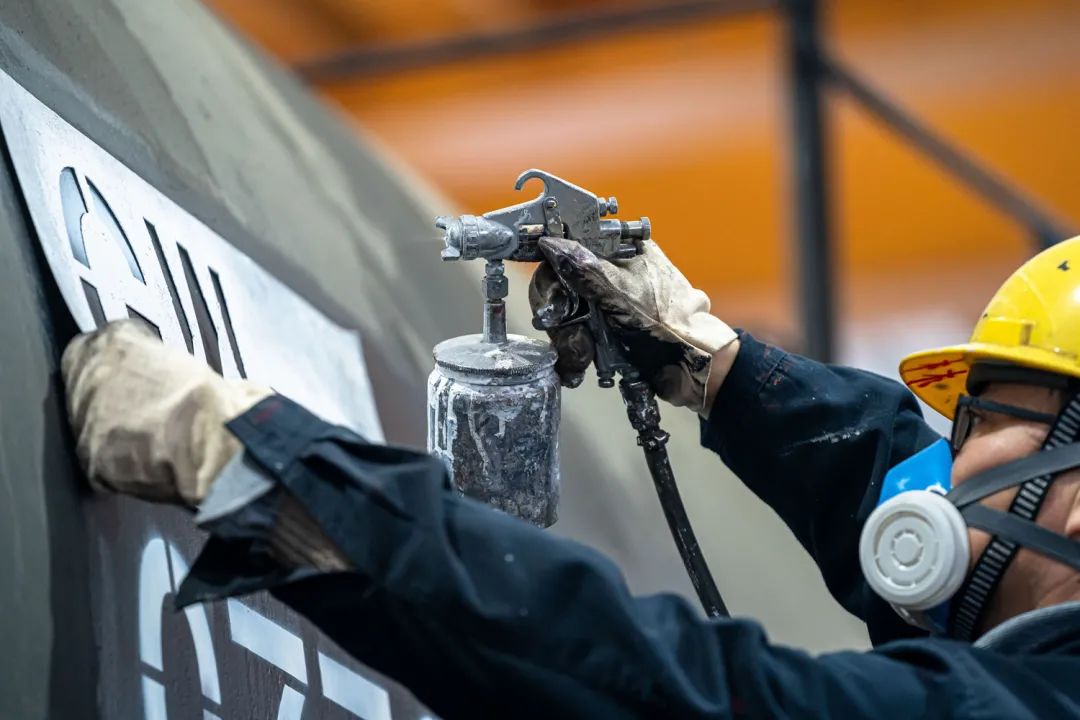黄桦军是油漆组的一员。作业前,他快速检查了自己的油漆喷枪,随后着手配制油漆。“油漆稀释水的比例大概占油漆的5%到7%,气温不一样,配制比例也会产生差别,夏天需要稀释水多点,冬天则少一点。”黄桦军说。
