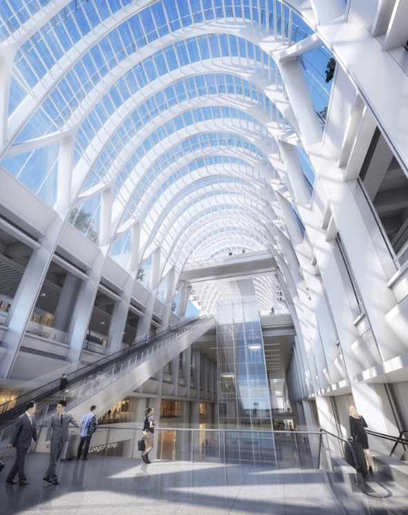地上五层设计有城市空中步行景观连廊和候车室商业夹层,通过设置在站房两侧的城市空中步行连廊,可实现站房与上盖开发、站房与城市、城市与上盖开发及站南、站北之间的便捷互通。