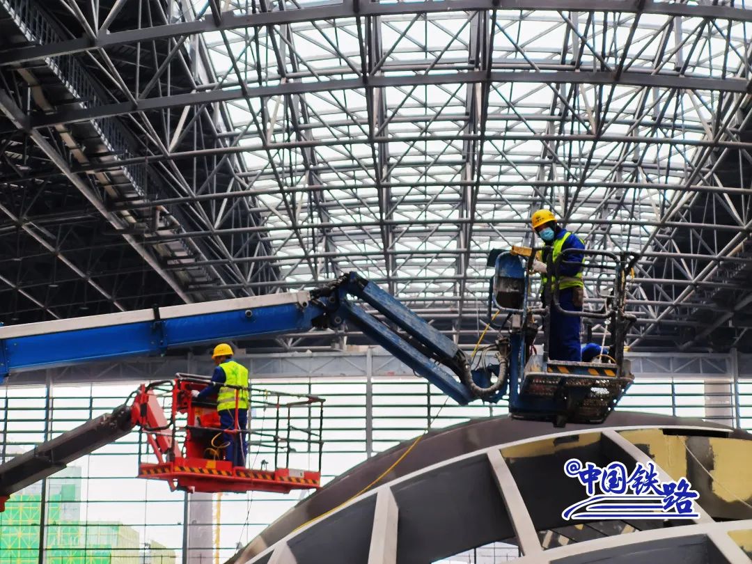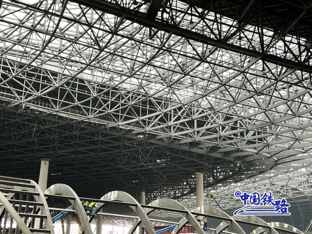 目前,站房屋面工程施工已基本完成,正进行立面幕墙施工。下一步,屋面还将进行太阳能光伏设备安装,充分利用太阳能发电,打造低碳环保的绿色高铁车站。