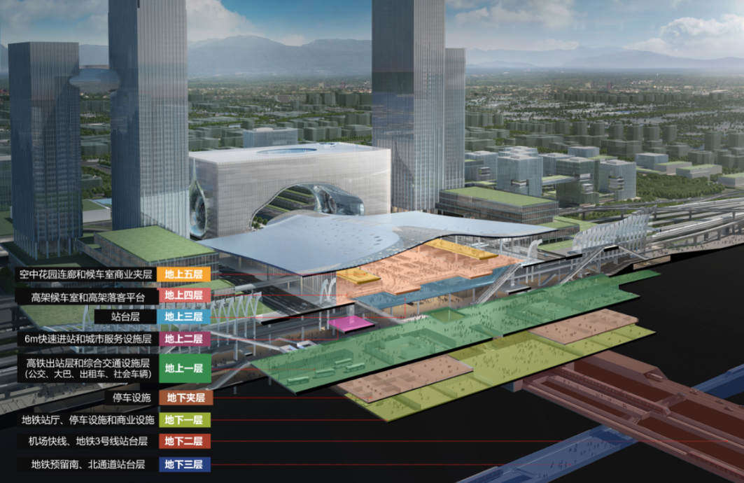 其中,地上一层为高铁出站层和综合交通设施层,地上二层为快速进站层。站台层和高架候车室、高架落客平台则是在地上三层和四层。