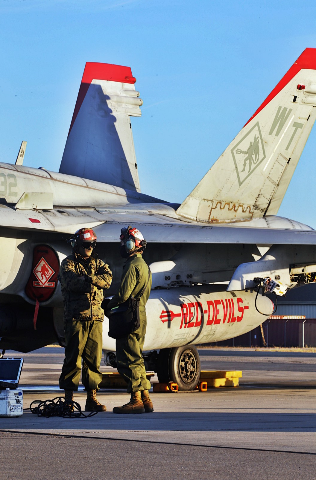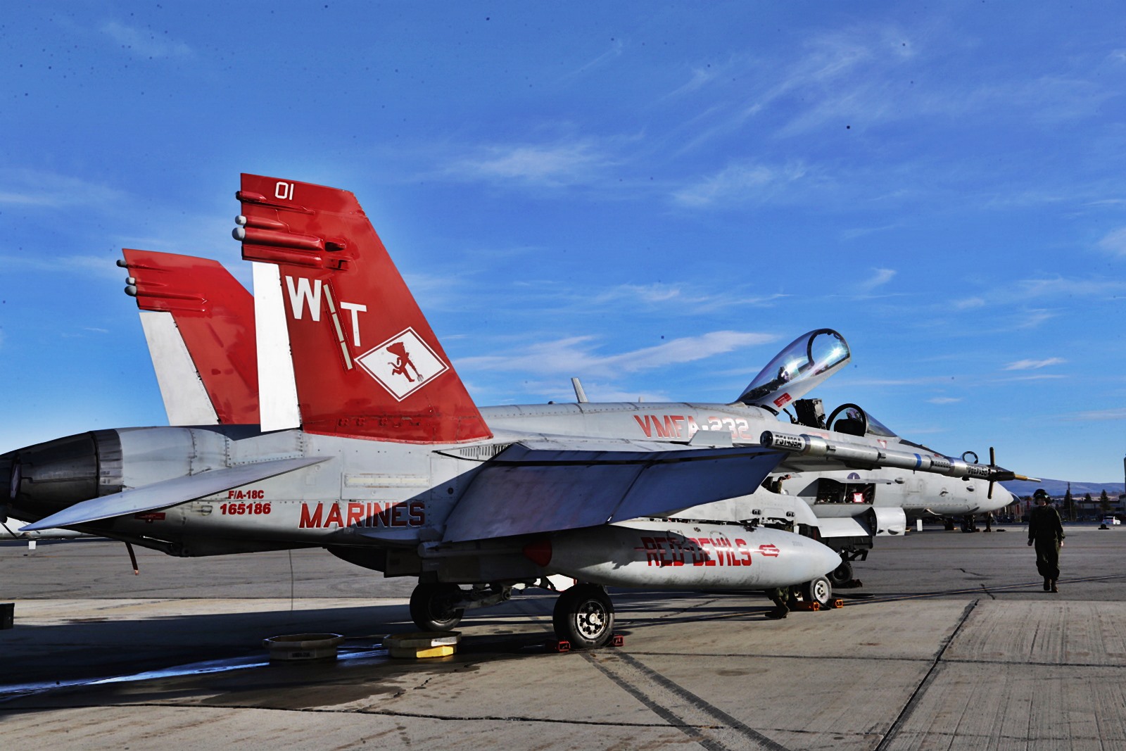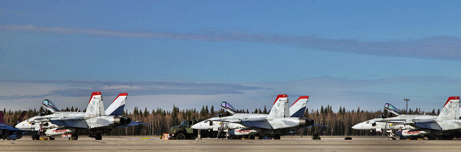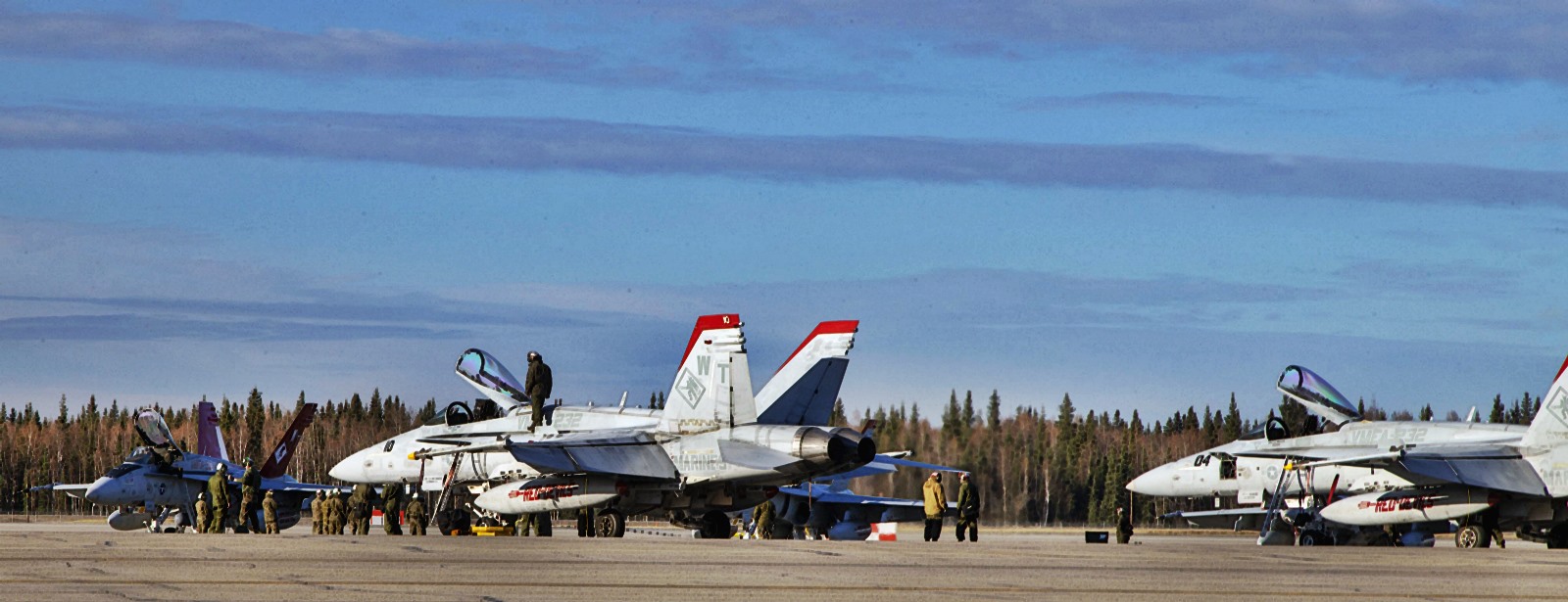 美军年度最重要的“红旗-阿拉斯加19-1”空中军事演习正在阿拉斯加举行,美国海军陆战队的F-18C战斗机也参与了军演,并进行了参演期间的训练。可以看到这些F-18C战斗机的涂装奇特,垂尾尖部有红色涂装,副油箱上则有“RED DEVILS(红色魔鬼)”字样。