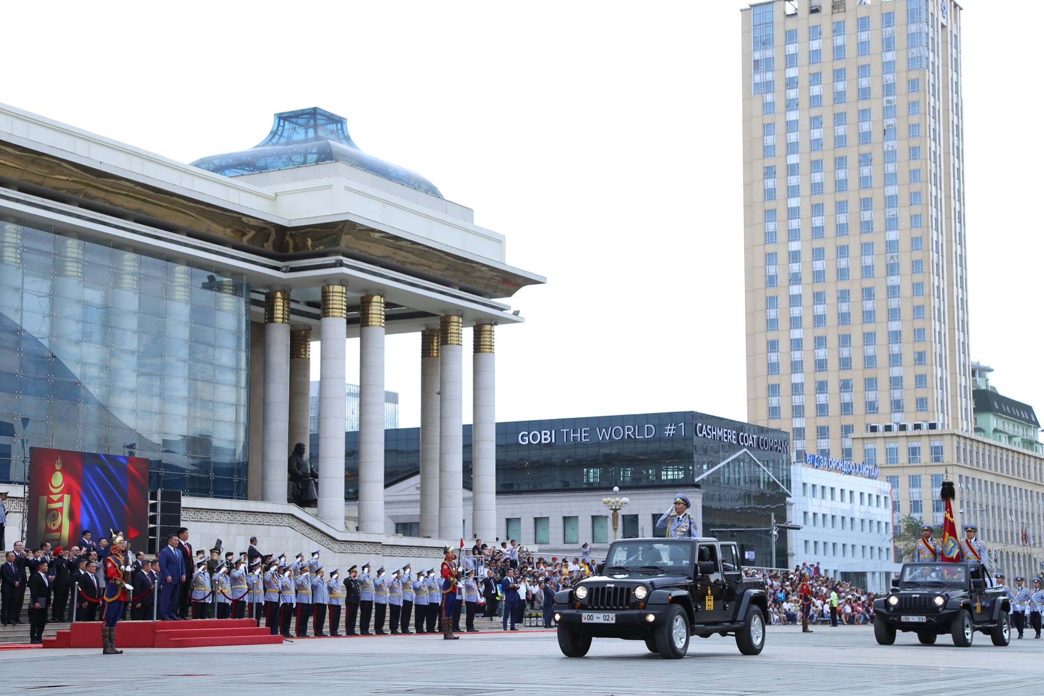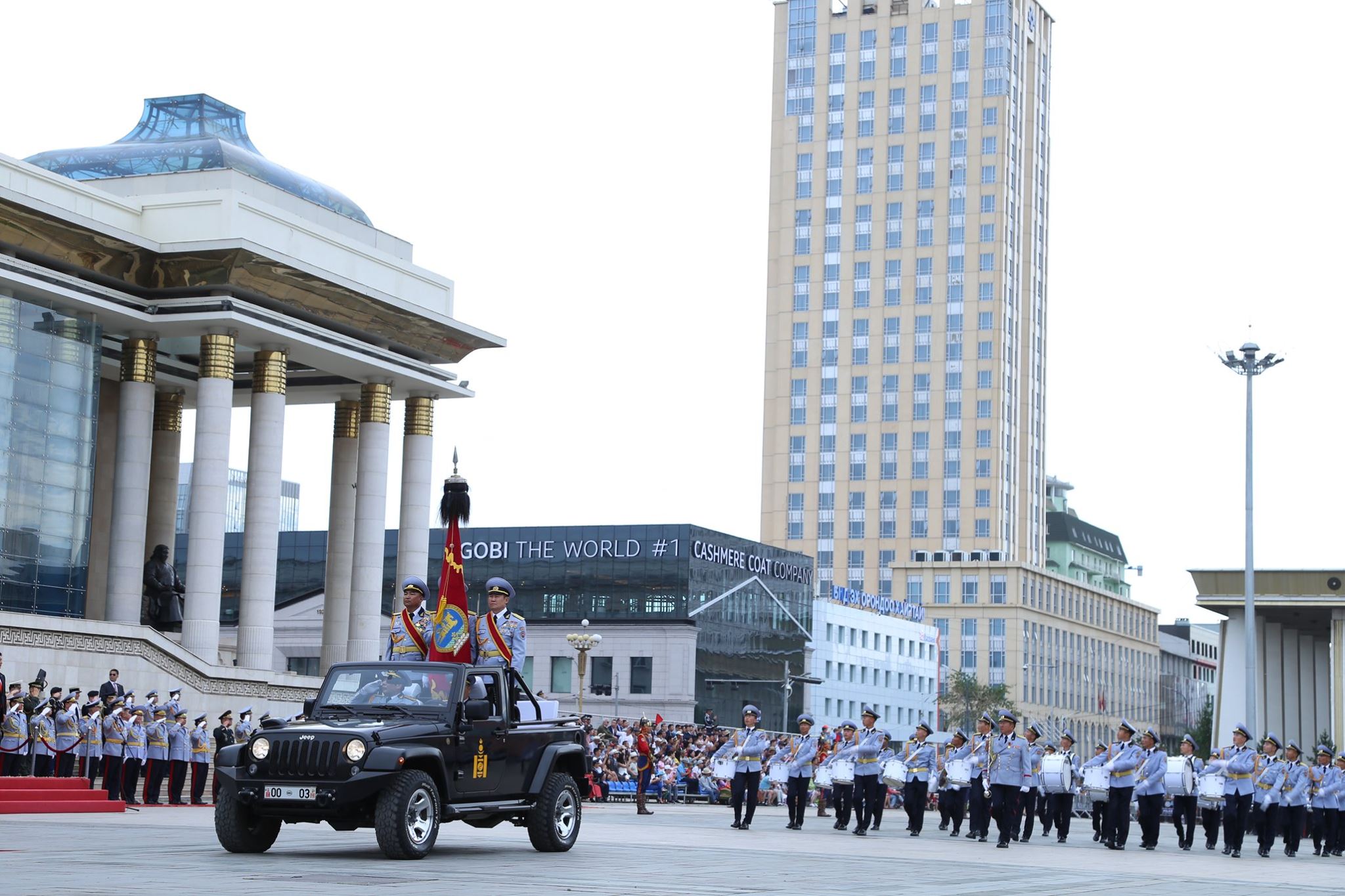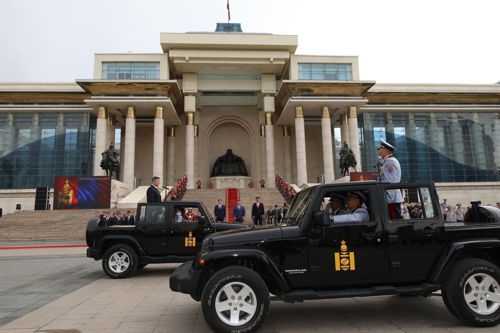阅兵式上,蒙古军队身穿传统铠甲,检阅车则使用美国吉普牧马人车型。
