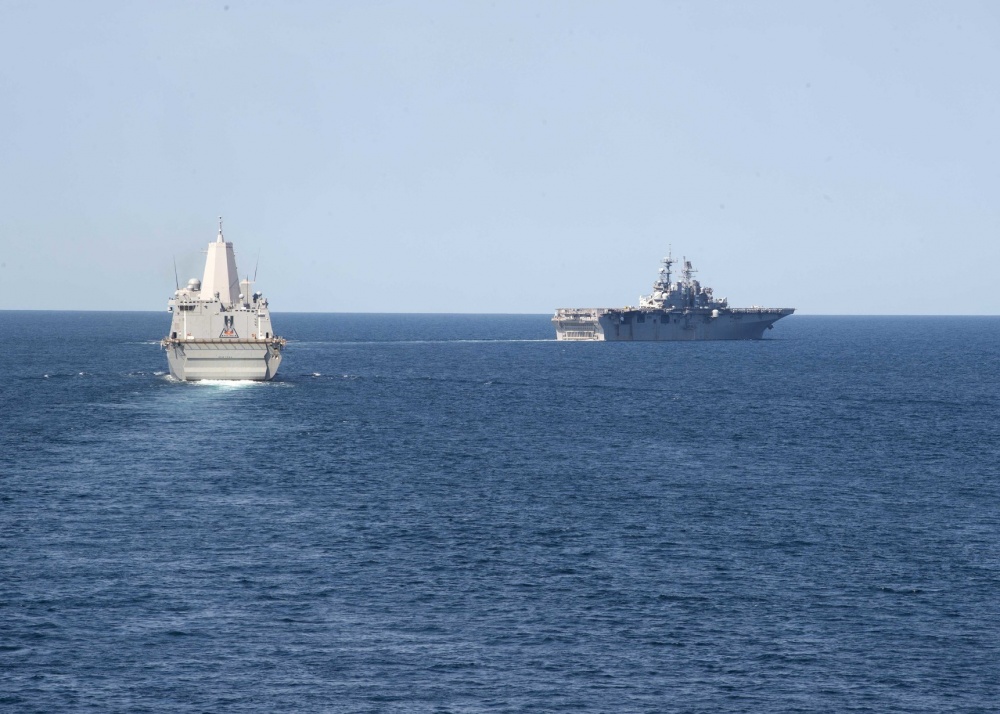 近日,美国海军“巴丹”号两栖攻击舰、 “纽约”号两栖船坞运输舰以及“橡树山”号船坞登陆舰在大西洋海域进行了一系列“水面战高级战术训练”。