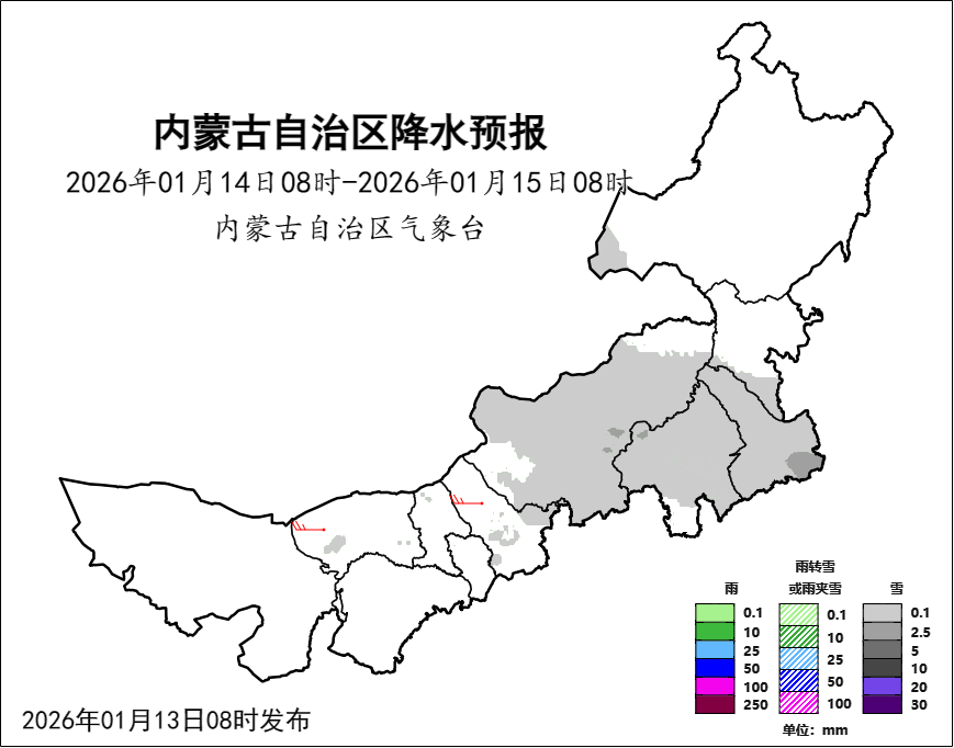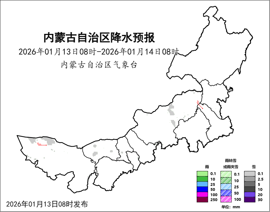 最新天气资讯如下:13日08时至14日08时,阿拉善盟西北部、巴彦淖尔市北部部分地区、包头市中部、呼和浩特市东北部、乌兰察布市东北部、锡林郭勒盟东部部分地区多云,有分散性小雪;西部大部、中部偏西、东部偏东地区4、5级局地8、9级偏西风或西北风,西部偏西和偏北局地伴有沙尘天气。