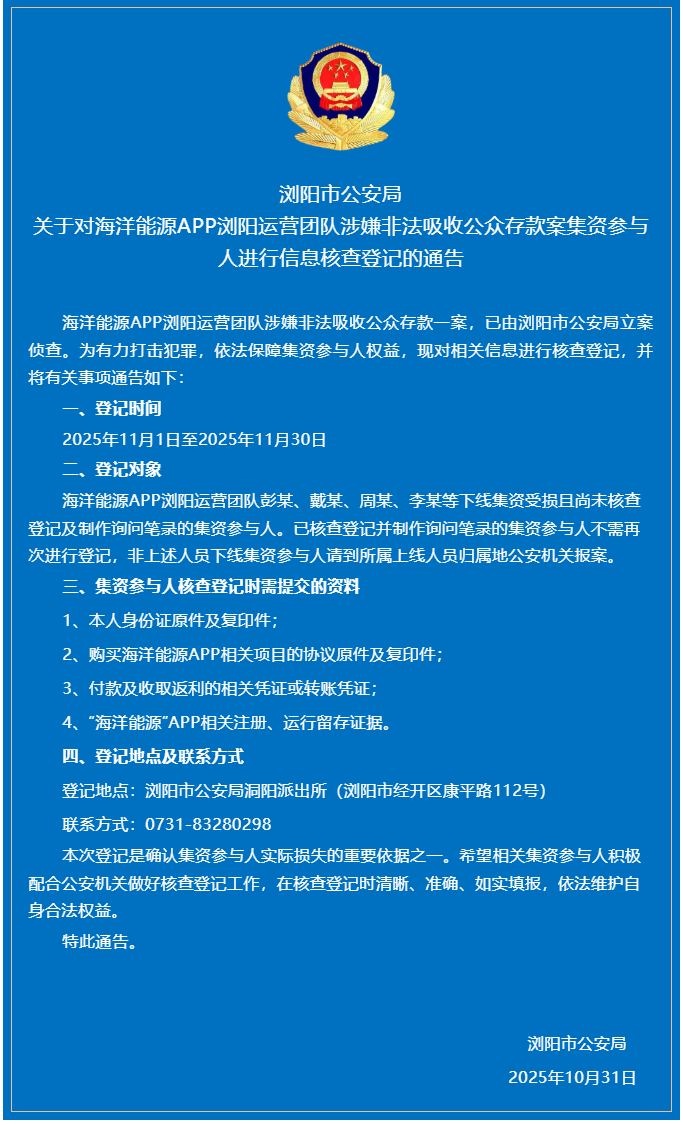 浏阳市公安局关于对海洋能源APP浏阳运营团队涉嫌非法吸收公众存款案集资参与人进行信息核查登记的通告: