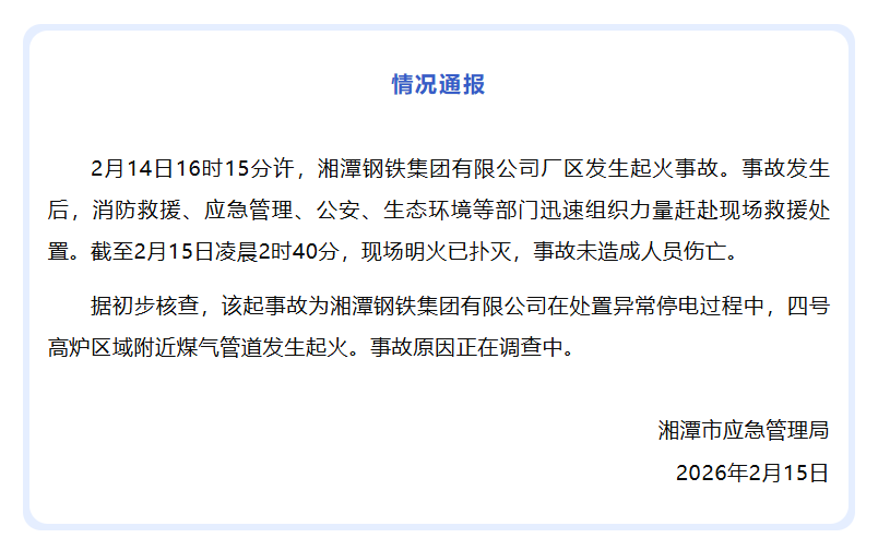 2月14日16时15分许,湘潭钢铁集团有限公司厂区发生起火事故。事故发生后,消防救援、应急管理、公安、生态环境等部门迅速组织力量赶赴现场救援处置。截至2月15日凌晨2时40分,现场明火已扑灭,事故未造成人员伤亡。