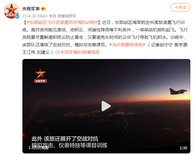 【#东部战区飞行员凌晨雨中驾机训练#】近日,东部战区海军航空兵某旅凌晨飞行训练。面对夜间能见度低、浓积云、间接性降雨等不利条件,一架架战机顺利起飞。飞行员既要尽量躲避积雨云防止雷击,又要避免长时间的云中飞行导致飞机积冰。训练中,该部队还演练了空战对抗、模拟攻击等课目。#当兵就要练练练# (记者赵宁宁 袁宇潮 王江伟 刘建义)