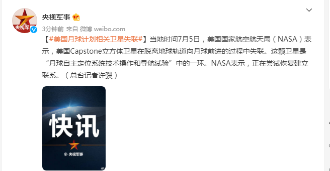 【#美国月球计划相关卫星失联#】当地时间7月5日,美国国家航空航天局(NASA)表示,美国Capstone立方体卫星在脱离地球轨道向月球前进的过程中失联。这颗卫星是“月球自主定位系统技术操作和导航试验”中的一环。NASA表示,正在尝试恢复建立联系。(总台记者许弢)
