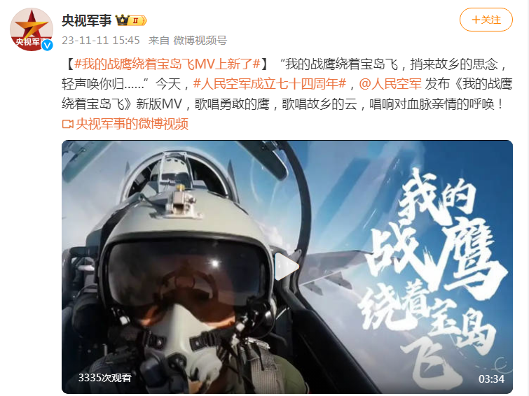 “我的战鹰绕着宝岛飞,捎来故乡的思念,轻声唤你归……”今天,人民空军成立七十四周年,@人民空军发布《我的战鹰绕着宝岛飞》新版MV,歌唱勇敢的鹰,歌唱故乡的云,唱响对血脉亲情的呼唤!