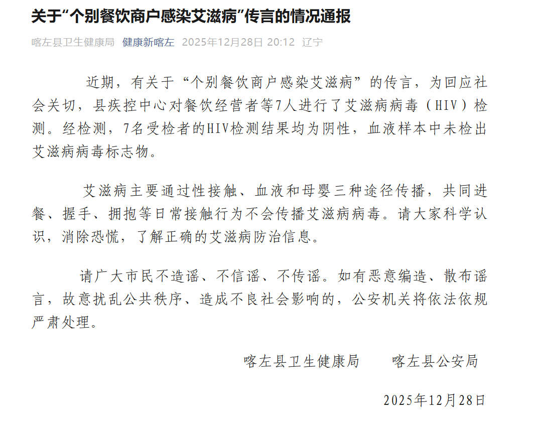 辽宁省喀左县回应“个别餐饮商户感染艾滋病”传言:受检者HIV检测结果均为阴性