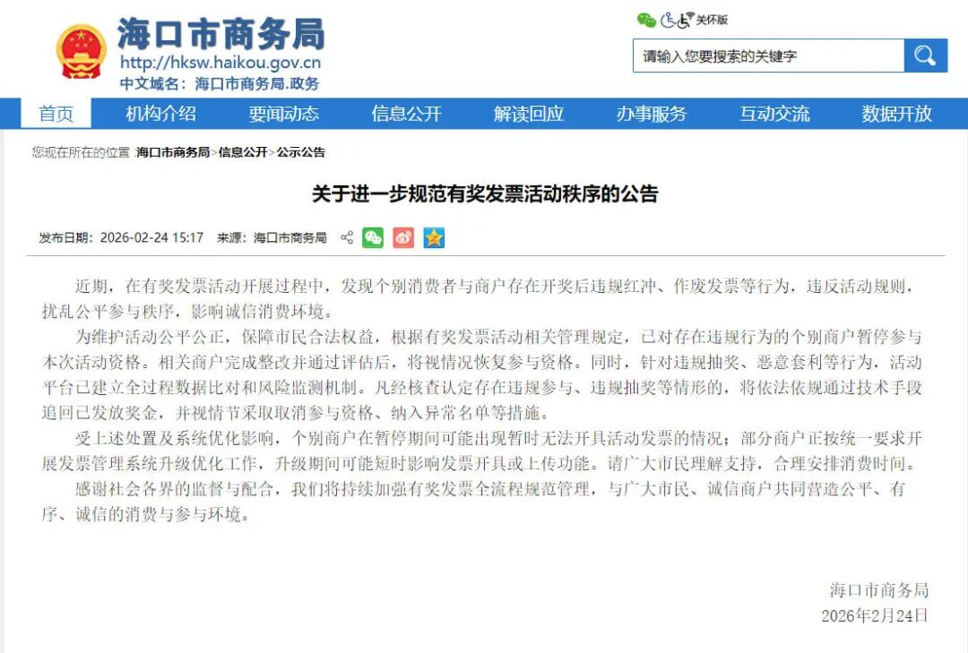 海口市商务局2月24日发布《关于进一步规范有奖发票活动秩序的公告》。该公告称,近期,在有奖发票活动开展过程中,发现个别消费者与商户存在开奖后违规红冲、作废发票等行为,违反活动规则,扰乱公平参与秩序,影响诚信消费环境。
