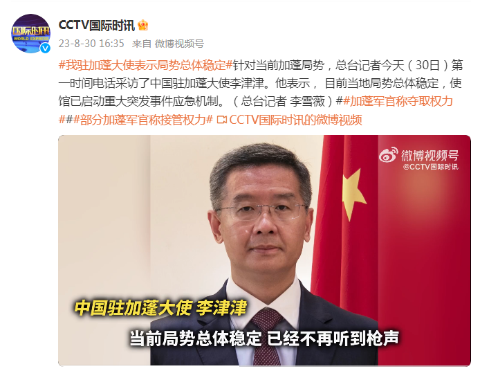 针对当前加蓬局势,记者今天(30日)第一时间电话采访了中国驻加蓬大使李津津。他表示, 目前当地局势总体稳定,使馆已启动重大突发事件应急机制。(总台记者 李雪薇)