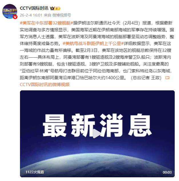 据伊朗法尔斯通讯社今天(2月4日)报道,根据最新实地调查与多方情报显示,美国海军近期在伊朗南部海域的军事存在持续增强。据军方消息人士透露,美军在波斯湾及阿曼湾海域的舰艇部署呈现动态调整趋势,整体维持高度戒备态势。详细数据显示,美军在这一海域的作战力量有所偏移。截至2月3日,美军在该地区的舰艇总数保持在32艘左右——具体布局上,阿曼湾部署有1艘驱逐舰及2艘海岸警卫队船只;波斯湾内则部署有9艘舰艇,包含1艘驱逐舰、3艘护卫舰及多艘辅助舰船。关注度最高的“亚伯拉罕·林肯”号航母打击群目前位于阿拉伯海南部、也门索科特拉岛以东海域,距离伊朗东南部阿曼湾沿岸港口恰巴哈尔大约1400公里。(总台记者 王政)