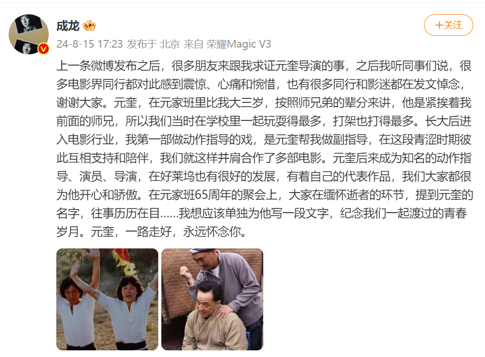 成龙微博发文:元奎,一路走好,永远怀念你