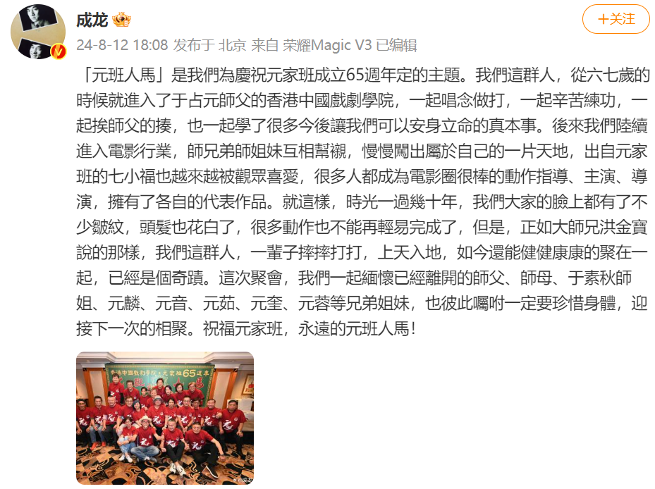 据新闻晨报此前报道,8月12日,著名演员成龙发文纪念元家班成立65周年,并晒出和同门们的大合照。