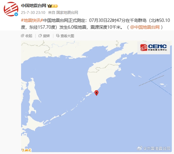 中国地震台网正式测定:7月30日22时47分在千岛群岛(北纬50.10度,东经157.70度)发生6.0级地震,震源深度10千米。