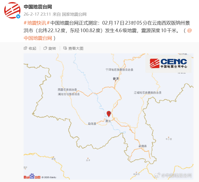 中国地震台网正式测定:02月17日23时05分在云南西双版纳州景洪市(北纬22.12度,东经100.82度)发生4.6级地震,震源深度10千米。